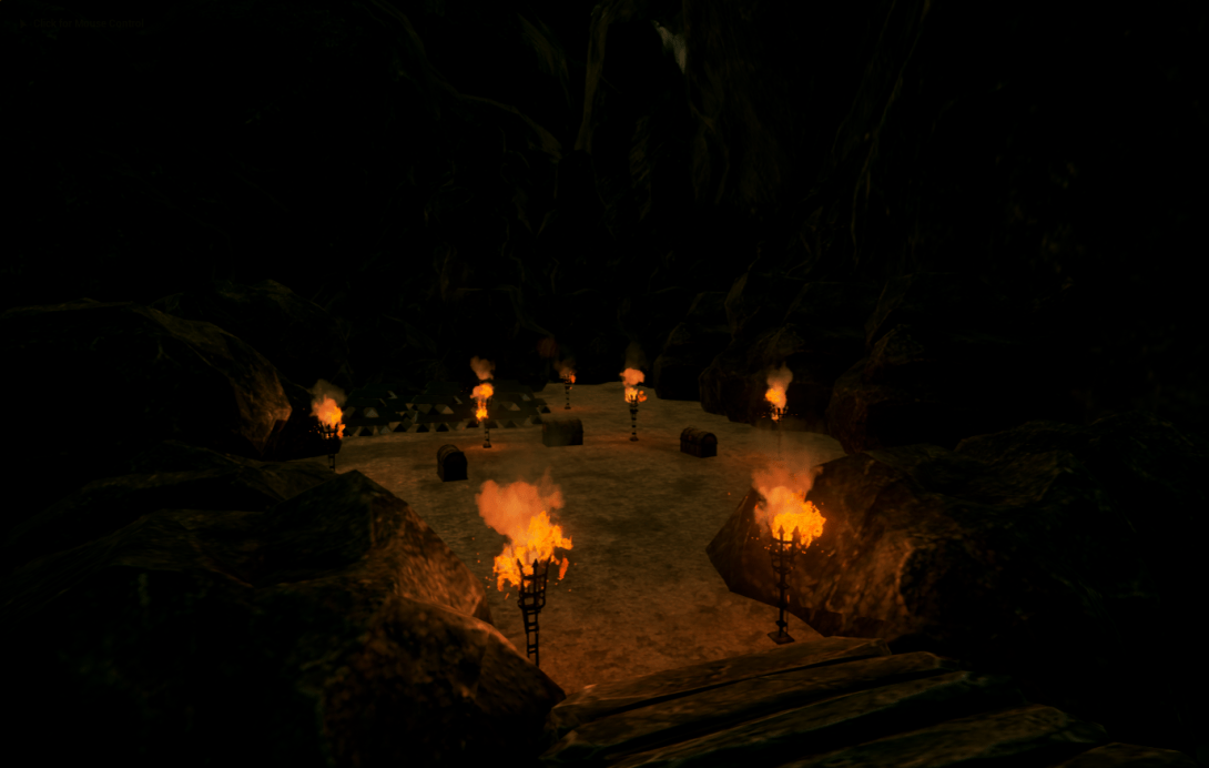 - The player starts at the entrance of the cave and walks down the path way lit by torches.